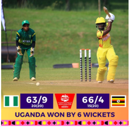 In the match played at the Entebbe Cricket Oval, Nigeria batted first and scored 63/9 in 20 overs. In response, Uganda achieved 66/4 in 15 overs.