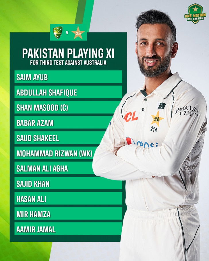 Pakistan on Tuesday revealed their Playing-XI for the third and final test against Australia with left-handed batter Saim Ayub set to make his Test debut.