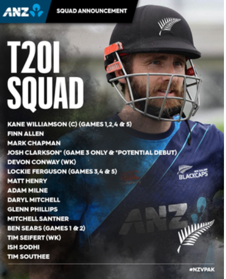 New Zealand T20 squad: Kane Williamson (c) (matches 1, 2, 4 and 5), Finn Allen, Mark Chapman, Josh Clarkson (match 3 only), Devon Conway (wk), Lockie Ferguson (matches 3, 4 and 5), Matt Henry, Adam Milne, Daryl Mitchell, Glenn Phillips, Mitchell Santner, Ben Sears (matches 1 and 2), Tim Seifert (wk), Ish Sodhi, Tim Southee