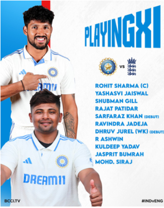 India: Yashasvi Jaiswal, Rohit Sharma (captain), Shubman Gill, Rajat Patidar, Sarfaraz Khan, Ravindra Jadeja, Dhruv Jurel (wicketkeeper), Ravichandran Ashwin, Kuldeep Yadav, Jasprit Bumrah and Mohammed Siraj