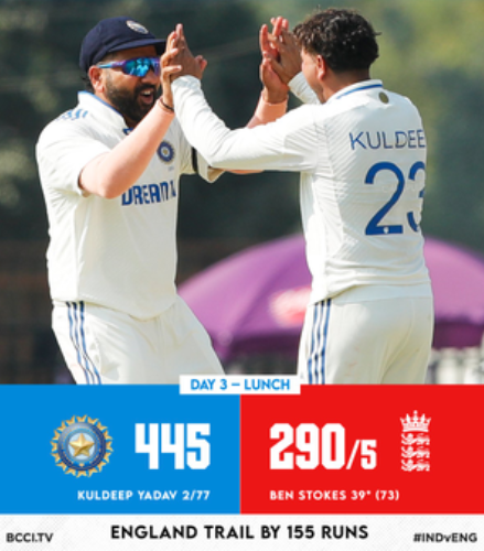 Brief Scores: India 445 in 130.5 overs (Rohit Sharma 131, Ravindra Jadeja 112; Mark Wood 4-114, Rehan Ahmed 2-85) lead England 290/5 in 61 overs (Ben Duckett 153, Ollie Pope 39; Kuldeep Yadav 2-77, Ravichandran Ashwin 1-37) by 155 runs