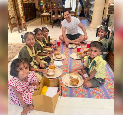 Taking to Instagram, the ‘Bawaal’ actor shared a few photos in which he is seen sitting on the floor with a group of kids. In the first image, Varun is seen posing happily with them after the Kanjak Puja. He is also seen enjoying halwa and puri prasad along with the children. Sharing the images, the actor simply wrote, “Happy Durga Ashtami #bestmeal.”