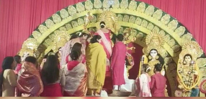 At the Urbana Housing Complex in Kolkata, crowds of men and women gathered early morning. The farewell ceremony began with offering prayers and sweets to the Goddess. Afterwards, women immersed themselves in Sindoor Khela, filling the entire complex with joy as people embraced and exchanged greetings.