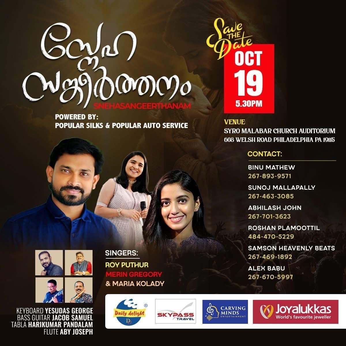 A special evening of music and fellowship, titled Snehasangeerthanam, will be held on Sunday, October 19, 2025, at 5:30 p.m. at the Syro Malabar Church Auditorium, 608 Welsh Road, Philadelphia, PA 19115.