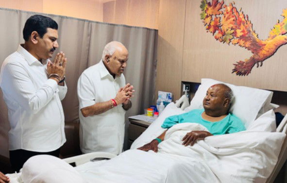 Yediyurappa, taking to social media, stated, "Today we went to Manipal Hospital and inquired about the health of senior national leader and former PM Sri H.D. Deve Gowda. I wish for the speedy recovery of this great leader, who launched a struggle for the nation and the farmers. I also wish him to be hale and hearty soon."