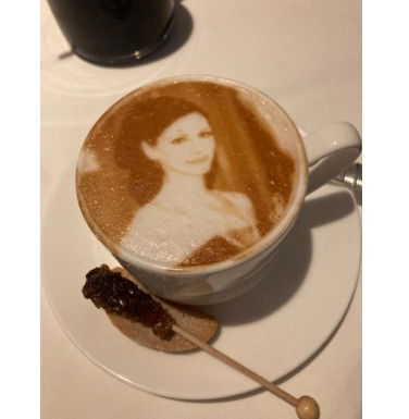 Roberts took to Instagram to share a picture of a steaming cup of coffee sitting pretty on her table, topped with latte art that wasn’t just any swirl or rosetta. It featured her own face frothed right into the foam.