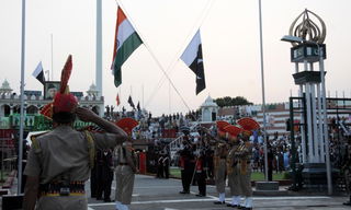 The public viewing of the daily flag lowering retreat ceremony at the Attari-Wagah ...