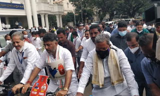 Karnataka Congress leaders after staging a bullock cart procession against the price hike a week ago, bicycled to Vidhana Soudha on Monday to attend the legislative session. The Congress demanded a minimum of 20 per cent reduction in prices of daily commodities and fuel....