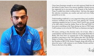 Indian cricket team captain Virat Kohli announced on Thursday that he will be quitting as the T20I captain after the completion of the men's T20 World Cup in Oman and the UAE in October....