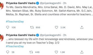 On the occasion of the Teachers' Day on Sunday, Congress General Secretary Priyanka Gandhi Vadra remembered her teachers and sent best wishes to them on this day. ...