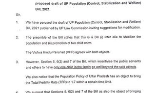 The Vishwa Hindu Parishad (VHP) has written a letter to the Uttar Pradesh State Law Commission, seeking removal of the one-child norm from the draft of its Population Control Bill....