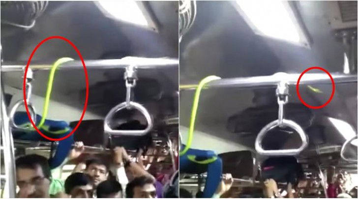 The green snake had entwined itself on the overhead handle bars on which commuters usually hang on to in the suburban trains.