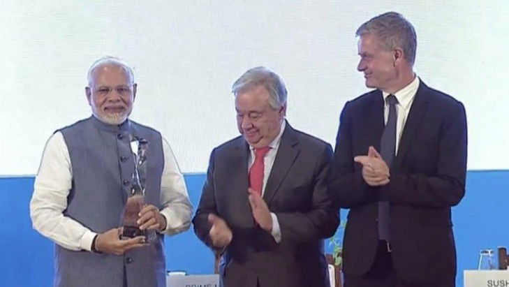 Modi, along with French President Emmanuel Macron, was named for this year's 'Champions of Earth' award by UNEP under the Policy Leadership category for their pioneering work in championing the International Solar Alliance (ISA) and promoting new areas of levels of cooperation on environmental action, including Macron's work on the Global Pact for the Environment and Modi's unprecedented pledge to eliminate all single-use plastic in India by 2022.