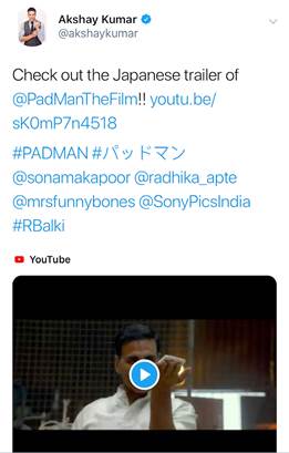 Akshay Kumar, who is naturally elated with this news, shared it on his official Twitter account and said, “Check out the Japanese trailer of @PadManTheFilm!! youtu.be/sK0mP7n4518 #PADMAN #パッドマン @sonamakapoor @radhika_apte @mrsfunnybones @SonyPicsIndia #RBalki â€