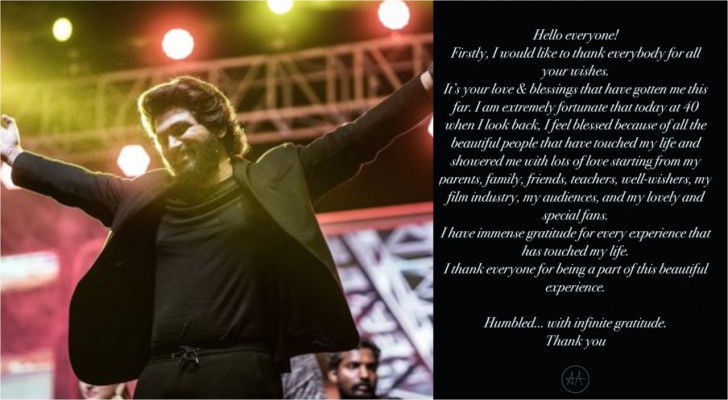"Hello everyone! Firstly, I would like to thank everybody for all your wishes. It's your love and blessings that have gotten me this far", Allu Arjun's post reads.