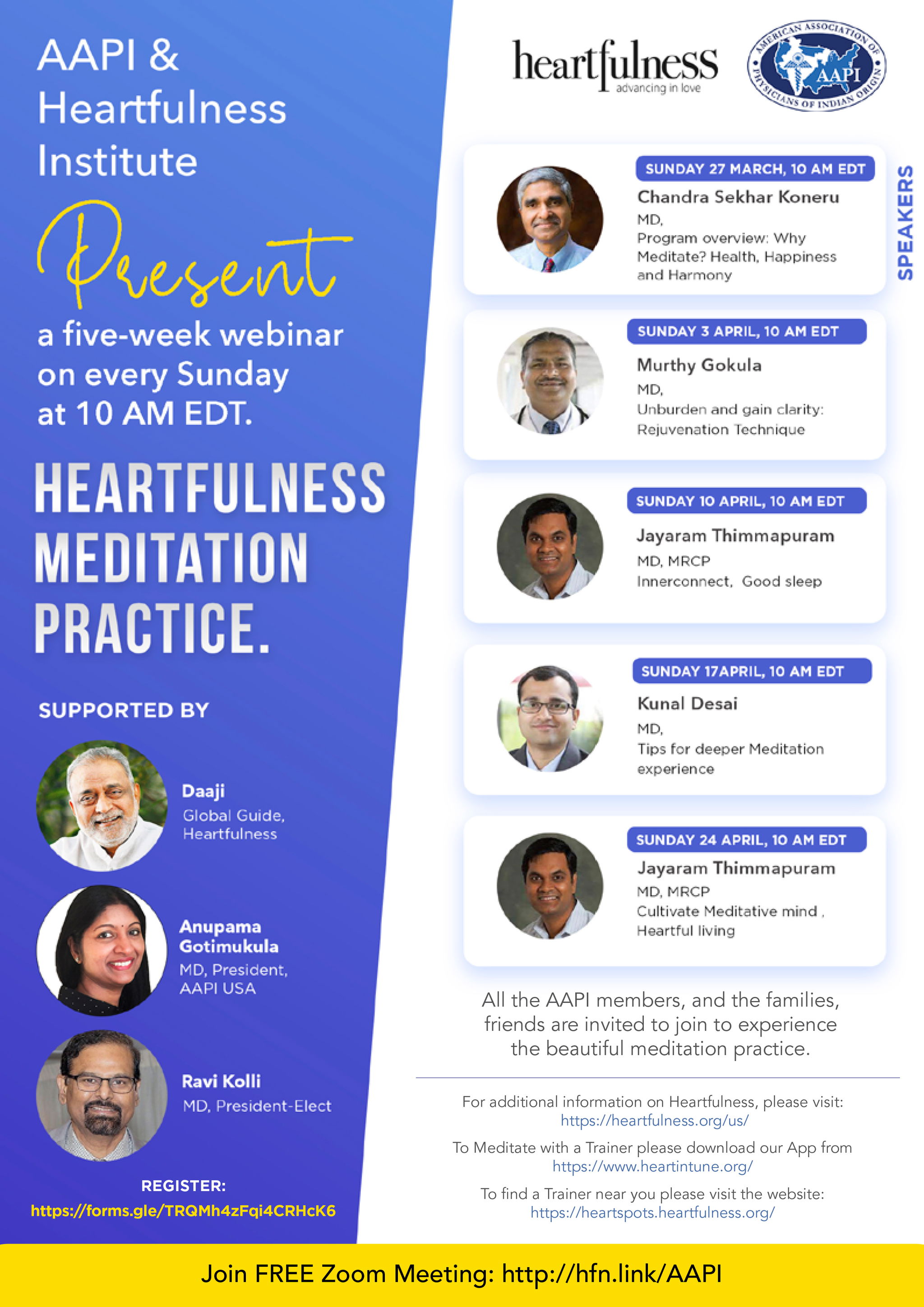 AAPI members, including Dr. Chandra Koneru, Dr. Murthy Gokula, Dr. Jayaram Thimmapuram, and Dr. Kunal Desai, who have been engaging in heart-based meditation for decades presented and led the hundreds of AAPI members who had joined in and participated in the webinars.
