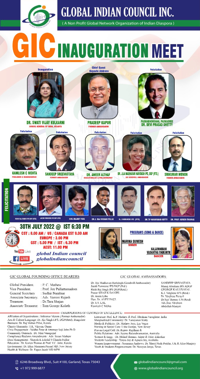 Global Indian Council (GIC) Inc. The purpose of the global network of people of Indian origin whose purpose is to connect, support, promote and empower youth, students, and professionals worldwide will be officially launched by IST at 6:30 P m, on social media platforms. (US CENTRAL STANDARD TIME 8:00 AM)