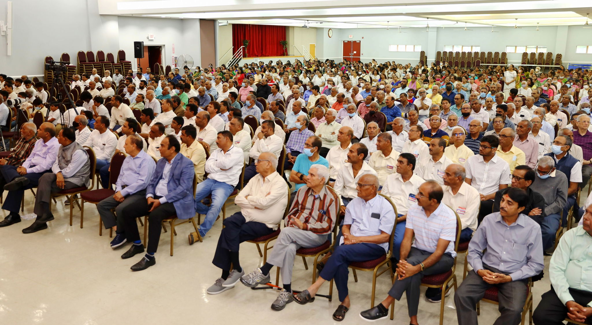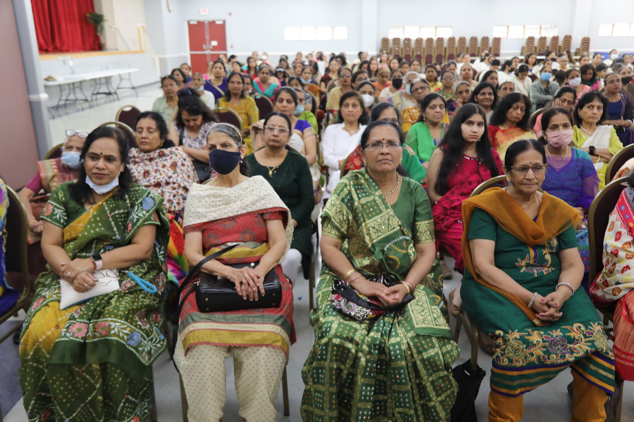 Although the time of the program was kept half past five, as the invited guests and devotees arrived early, the program started from five o'clock and in sight, the hall of Jain Mandir was filled with more than 900 guests and devotees. From five o'clock the listeners were immersed in the Bhajan-kirtans. After that the secretary of YDS Chicago Shri. Chirantan Nanavati started the program welcoming by the saints from "Haridham" Sokhda. Anandswarup Swami and P. Gunagarahkaswami and P. Dinkar Uncle. He gave an occasional address to P.P. Hariprasadaswami described how he created this society from scratch with love and warmth.