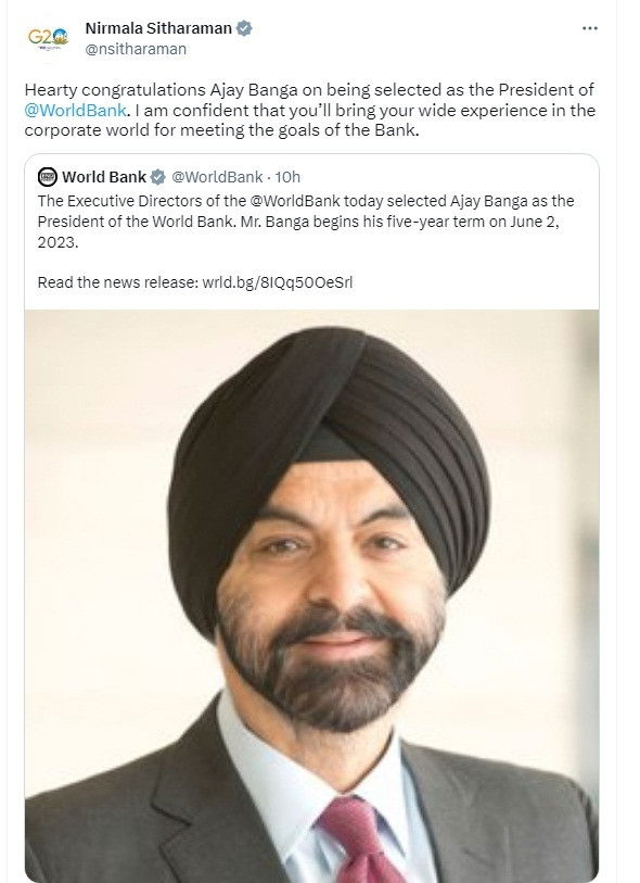 "Hearty congratulations Ajay Banga on being selected as the President of @WorldBank. I am confident that you'll bring your wide experience in the corporate world for meeting the goals of the bank," she said in a tweet.