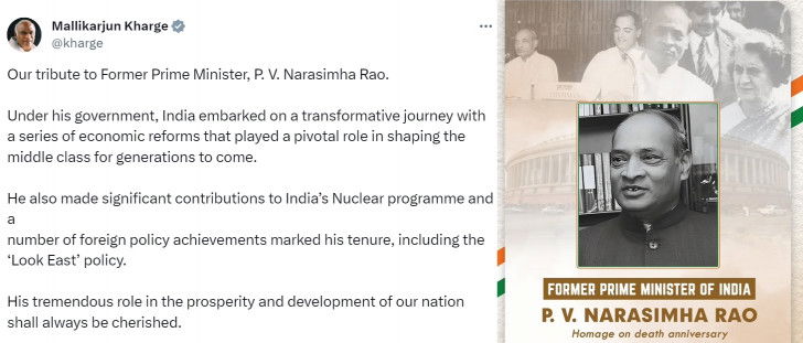 In a post on X, Kharge said, "Our tribute to Former Prime Minister, P. V. Narasimha Rao. Under his government, India embarked on a transformative journey with a series of economic reforms that played a pivotal role in shaping the middle class for generations to come."