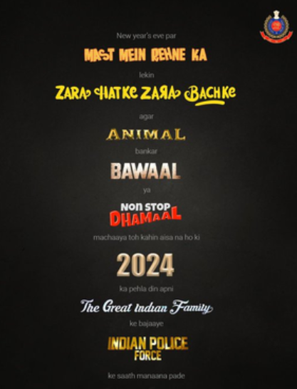 The advisory took a cinematic turn as it implored, ''New Year's eve par 'Mast Mein Rehne Ka', lekin 'Zara Hatke Zara Bachke', agar 'Animal' bankar 'Bawaal' ya 'Nonstop Dhamaal' machaaya toh kahin aisa na ho ki 2024 la pehla din 'The Great Indian Family' ke bajayee 'Indian Police Force' ke saath manaana pade.''