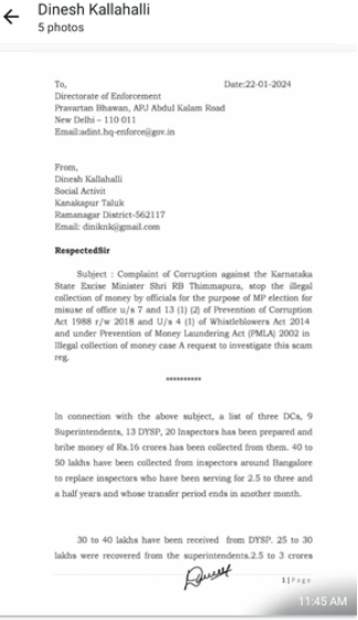 The complaint was filed by RTI activist Dinesh Kallahalli with the New Delhi ED office. In his complaint Dinesh has urged the ED to stop the corruption by Minister Thimmapura and also illegal collection of money by officials for the purpose of the MP election.