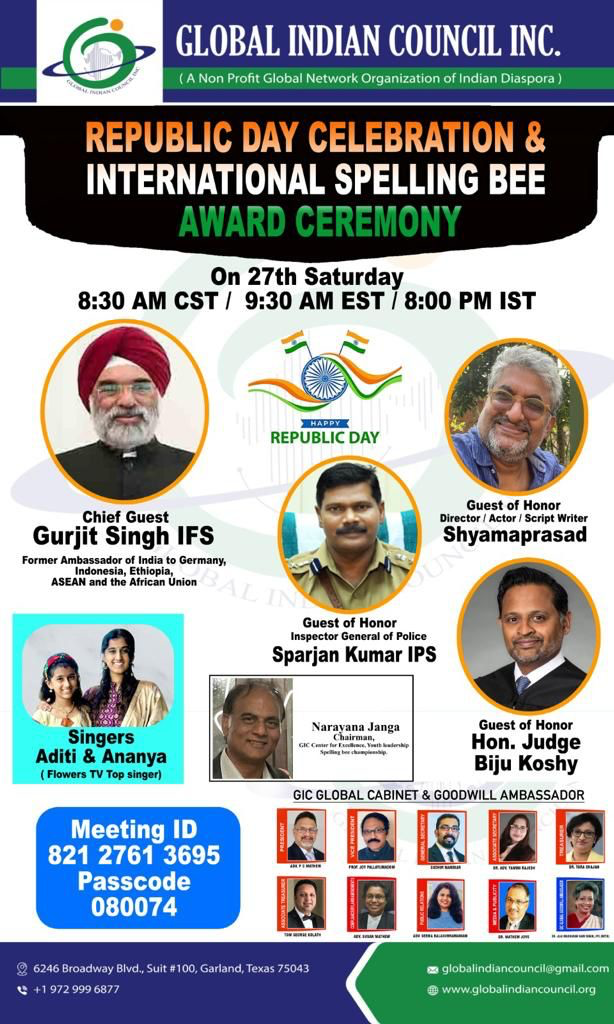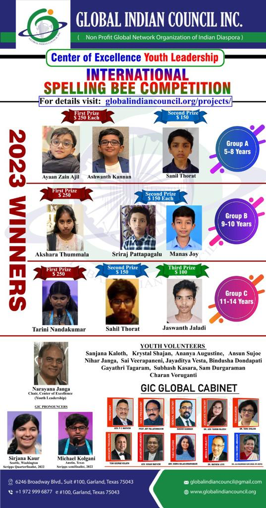 GIC began its Spelling BeeWorkshop on Oct 28, 2023. GIC's CoE Youth Center of Excellence conducted the workshop by volunteers from former US spelling Bee Champion Ansun Sujoe, 2014 Scripps Spelling BeeCo-Champion, Sirjana Kaur, three times Scripps National qualifier and Quarterfinalist and Michael Kolgani - Scripps semifinalist 2022. It was hosted by Global Indian Council General Secretary Sudhir Nambiar and Global CoE for Youth Chairman Narayana Janga wherein GiC President PC Mathew, Dr. Tara Shajan, Dr. Mathew Joys, were extended tremendous support for its success along with Youth coordinators Nihar Janga Ananya Augustine, Sanjana Kaloth, Krystal Shajan, Ansun Sujoe. During the session, all contestants received numerous spelling bee preparation tips from panelists and got an online opportunity to practice their skills.