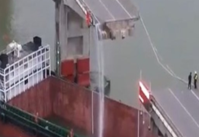 The incident occurred around 5.30 a.m. when a container ship hit the pier of the Lixinsha Bridge, plunging five vehicles, Xinhua news agency reported.