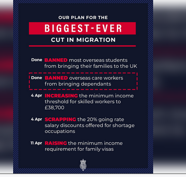 As part of the UK government's plan to bring down unsustainable levels of legal migration and tackle visa abuse, overseas care workers coming to the country will now be restricted from bringing dependants, starting from Monday itself.