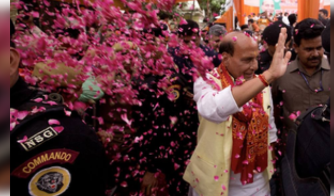 Flanked by the Chief Ministers of Uttar Pradesh and Uttarakhand, Union Defence Minister Rajnath Singh took out an impressive roadshow on Monday from the BJP state headquarters to the District Collectorate, to file his nomination for the Lucknow Lok Sabha seat.