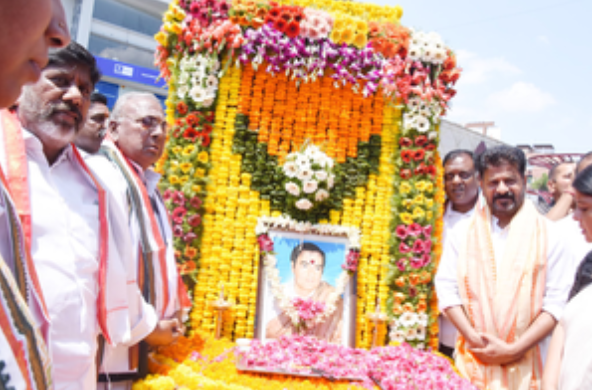 Revenue Minister Ponguleti Srinivas Reddy paid tributes to Rajiv Gandhi by garlanding his statue in Khammam.