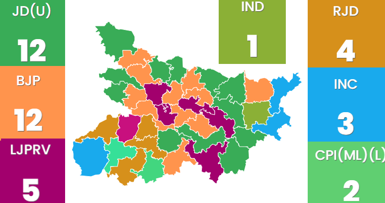 NDA partners BJP and JD-U got 12 seats each, Chirag Paswan-led LJP-Ram Vilas (LJPRV) won five, and Jitan Ram Manjhi's Hindustani Awam Morcha (Secular) got one seat. Similarly, INDIA bloc allies RJD won four seats, Congress (3), and CPI-ML (2). Independent (Pappu Yadav) won one seat.