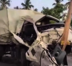 The container truck, which was on its way to Bhimavaram from Puducherry collided with a DCM van coming from the opposite direction.