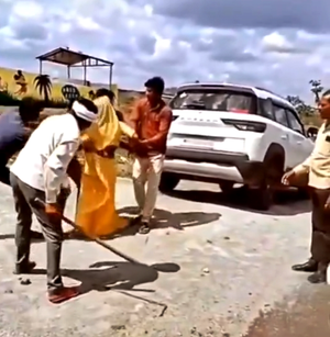 The video shows the helpless saree-clad woman being thrashed with sticks while three men hold her hands tightly. Around a dozen more surround her to prevent her from running away.