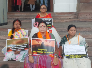 Four woman women BJP legislators led by the fashion designer-turned-politician and the party MLA from Asansol-Dakshin Assembly constituency Agnimitra Paul, sat on the main staircase leading to the Assembly hall carrying posters. They slammed the state government and the ruling party on the issue of atrocities against women.