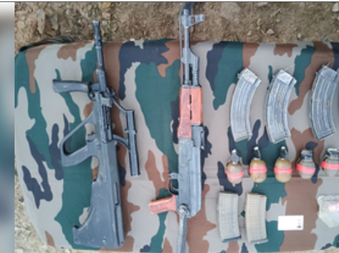 The Army said on Friday, “A huge cache of arms and ammunition, including a Steyr AUG (an Austrian-made bullpup assault rifle), AK series rifle, five grenades, and other materials, was recovered from two killed foreign terrorists in the Keran Sector of Kupwara district yesterday”.