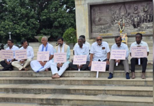 BJP MP Kota Srinivas Poojary staged a protest in front of the Mahatma Gandhi statue at Vidhana Soudha on Monday in Bengaluru, urging Chief Minister Siddaramaiah to retract the allegations made against him in connection with the alleged misappropriation in the Bhovi Corporation.