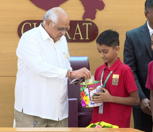 Children from St. Xavier's School and the School of Achievers in Gandhinagar visited the Chief Minister's residence to offer their contributions to the Teachers' Welfare Fund.