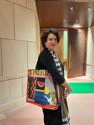 Congress lawmaker Priyanka Gandhi reached Parliament on Monday with a ‘Palestine’ tag on her handbag, drawing the attention of fellow Parliamentarians and television cameras alike.