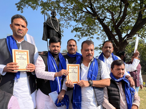 A group of Congress MLAs, led by the Leader kr Opposition (LoP) Umang Singhar, dressed in blue and holding the copy of the Indian Constitution arrived at the Assembly premises and staged a protest near Mahatma Gandhi's statue.
