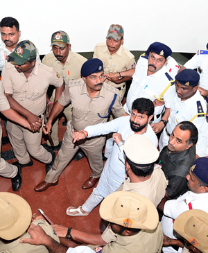 BJP leaders, including state President B.Y. Vijayendra, Leader of Opposition R. Ashoka and BJP MLAs are following the police convoy in their vehicles.