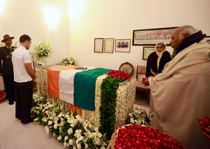 Sonia Gandhi and Rahul Gandhi placed a wreath at his mortal remains wrapped in the tricolour and offered prayers there.