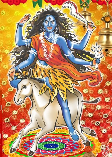 The name "Kaalratri' is a fusion of "kaal", which means time or death, and "ratri", which means night or darkness or ignorance. Thus, Kaalratri embodies the force that brings an end to darkness, signifying the emergence of light and wisdom.