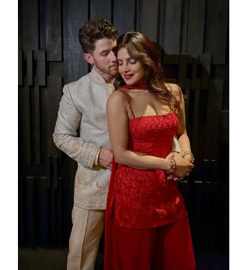 Husband Nick Jonas accompanied his better half in the festivities in a cream embroidered sherwani. Little Malti Marie Chopra Jonas also twinned with her dad, Nick, in a matching frock.