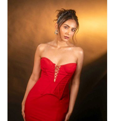 Rakul took to Instagram, where she shared a picture of herself looking every-inch-gorgeous in a fiery red outfit with a corset top and thigh high slit skirt. The picture had her newly dropped song “Raat Bhar” playing in the backdrop.