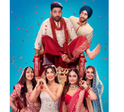 The motion poster opens with a fun twist as Kapil Sharma, dressed as a groom, makes a grand entrance on a doli — only to be carried by his four brides, leaving Manjot Singh utterly shocked.