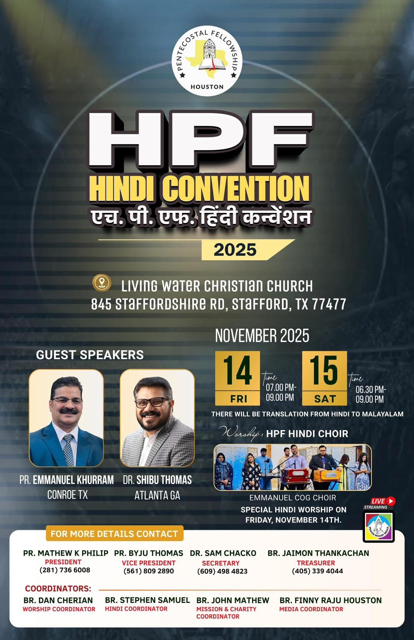 The Houston Pentecostal Fellowship (HPF) will host its much-anticipated Hindi Convention 2025 on November 14 and 15 at Living Water Christian Church, located at 845 Staffordshire Road, Stafford, TX 77477.