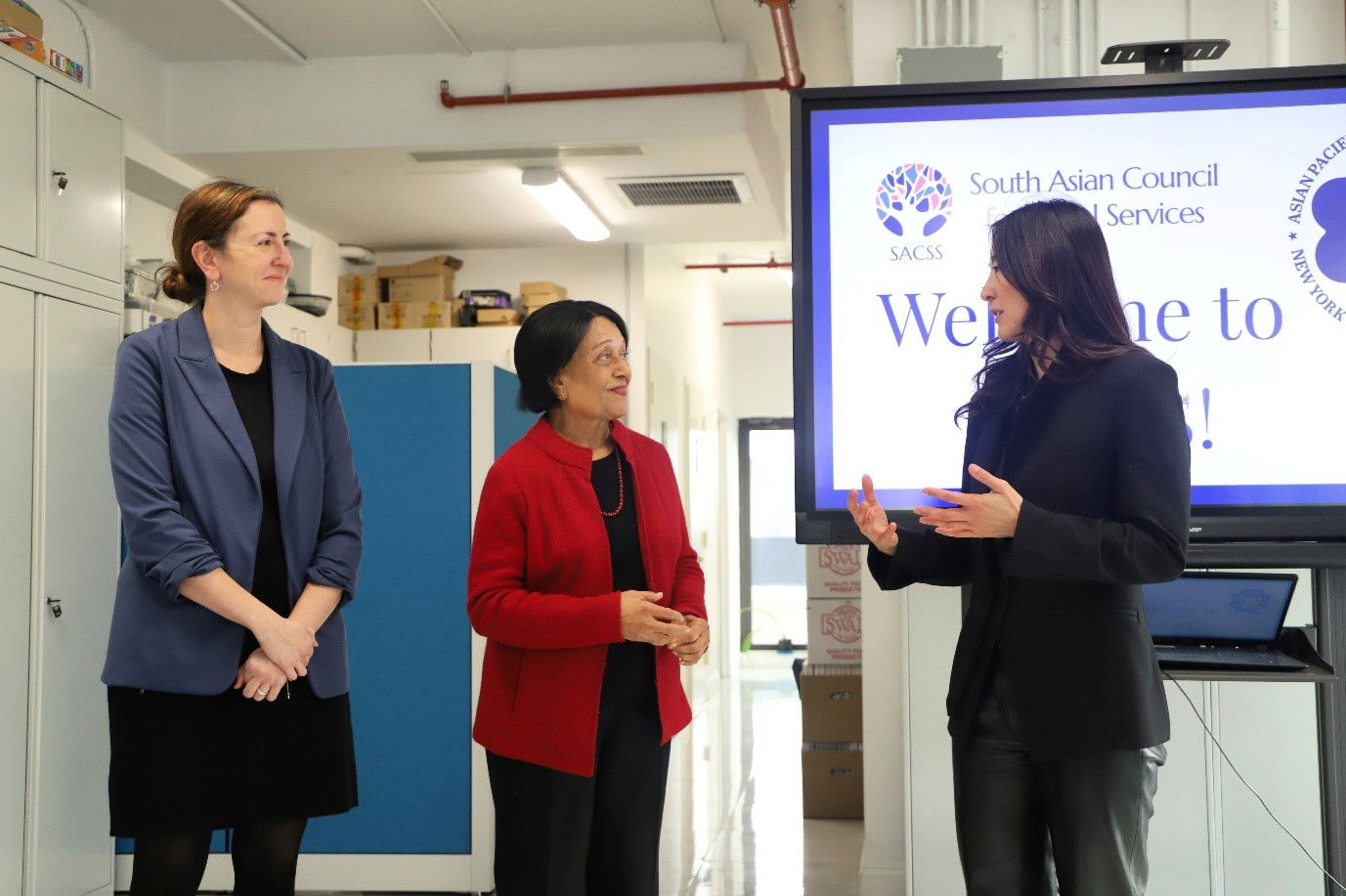 Assemblywoman Nily Rozic, Sudha Acharya, Executive Director of SACSS, and Assemblymember
