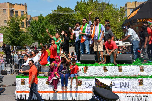 Chicago IL: The boisterous patriotic fervor overwhelmed with confluence of colorful floats, marching bands, music, dancing troupes and the deafening drum-beats of Indian dholaks were robustly irrepressible even under scorching summer weather as FIA-Chicago kicked-off yet another stunning India Independence Day Parade with gathering crowds cheering reaching piercing decibels on the Saturday afternoon of August 15, 2015 on Devon Ave in Chicago.