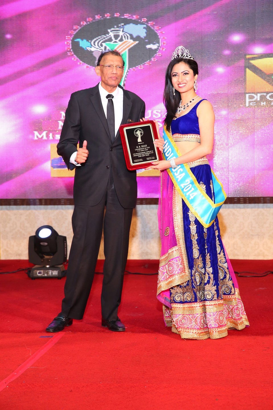 H.R. Shah receiving a plaque of appreciation by outgoing Mrs. India USA, Namita Dowadkar